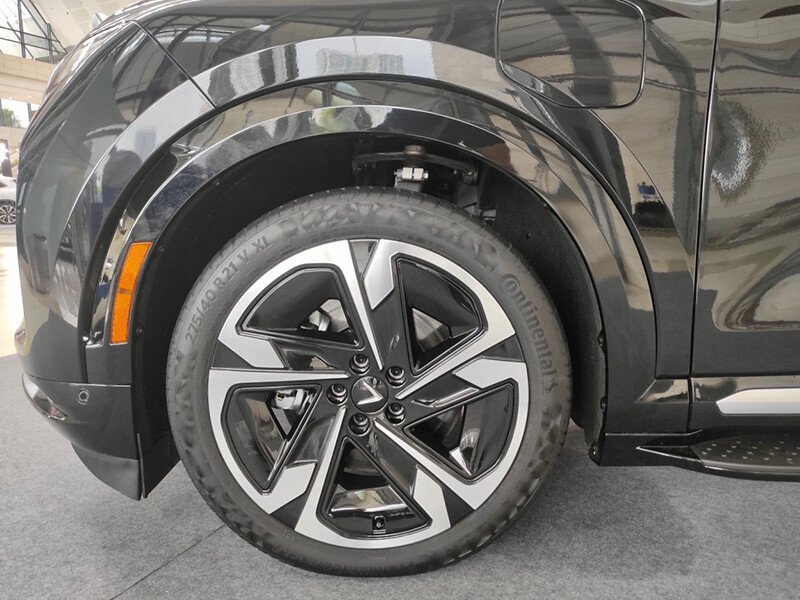 Ở phần thân xe VinFast VF9 có la zăng khủng hơn các đối thủ khi sở hữu bộ vành lớn 21 inch. VF9 còn có 1 chi tiết đáng chú ý khác là phần kính ở hông xe được tách làm đôi ở cột C bởi logo chữ “V” của VinFast.